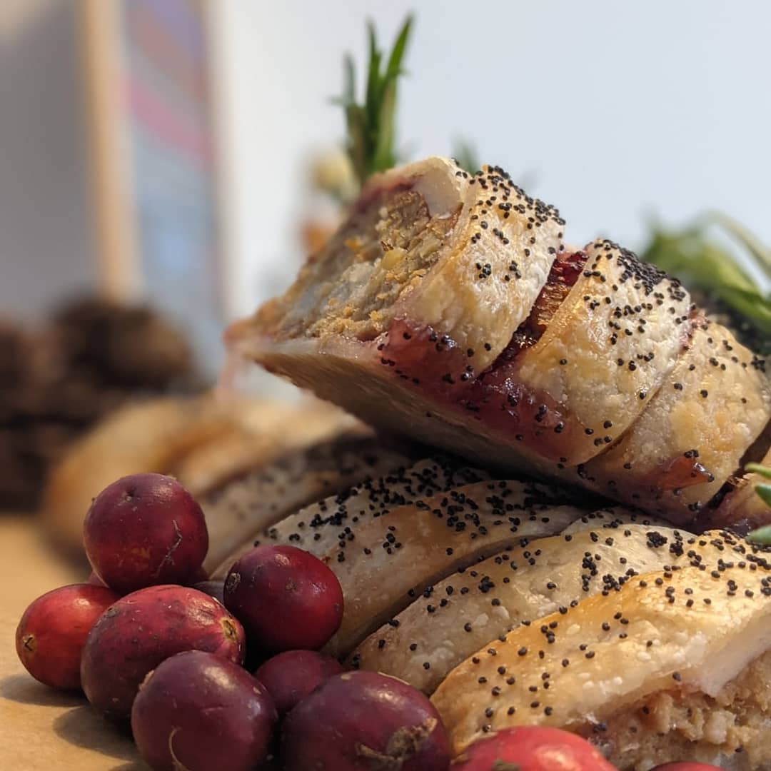 A show-stopping centrepiece made with a veggie lentil mix, layered with seasonal herbs and spices and wrapped in golden gluten free puff pastry.